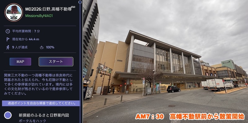 まずは、京王線の高幡不動駅の南口から始まる「MD2026:日野、高幡不動尊」というミッションを開始。
