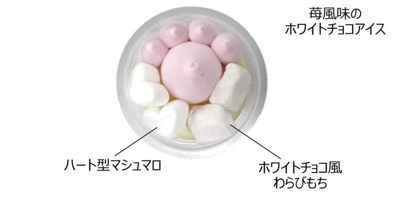 ピンクの肉球部分は苺風味のホワイトチョコアイス、白い部分はハート型マシュマロとホワイトチョコ風わらびもちです。