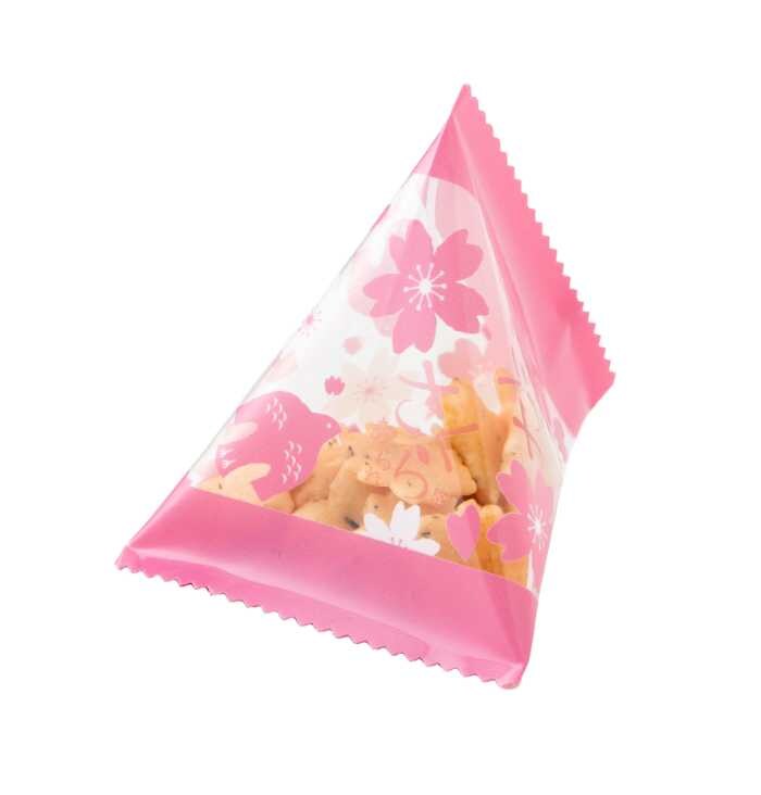 国産米を100%使用し、塩漬けした国産桜葉を練り込んだ桜型の小粒あられ。さっくり軽やかな食感に焼き上げ、淡口醤油であっさりと仕上げています。ひと口ごとに、ふわりと桜の香りが広がります。