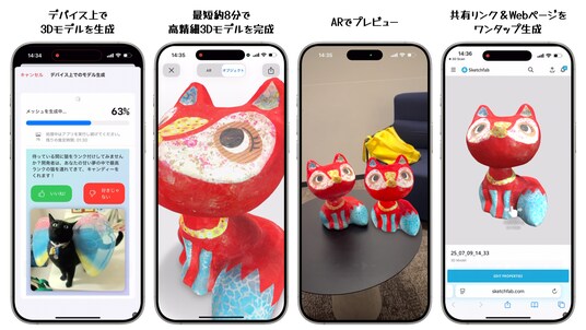 iPhone撮影だけで共有可能な3Dモデルを生成。ARプレビューや3Dプリントにも活用可能(世界**5万+**ダウンロード)。