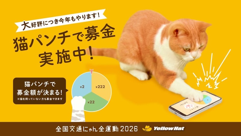 イエローハットでは、今回の取り組み「猫パンチで募金」を紹介する「全国交通にゃん全運動2026」のCMも制作。