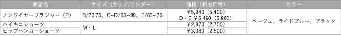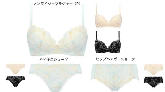 背部はテープレス仕様でアウターにもひびきにくく、編みレースにはクレマチスのモチーフを採用。カラーはシーズンらしい華やかなラインナップで、サイズ展開は色によって異なります。