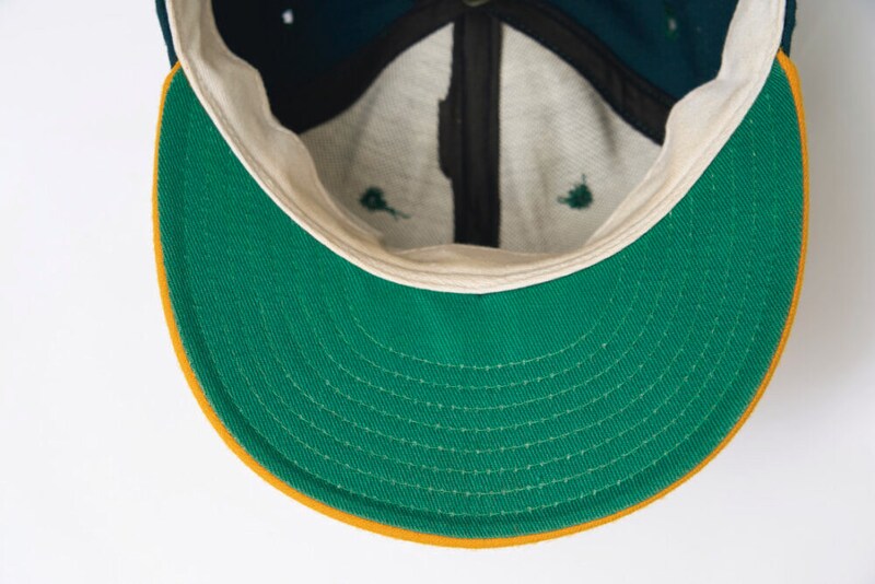 古着のキャップを裏返すとバイザー裏に鮮やかな緑のフェルト生地が縫い付けられていることがある。これはもともとビリヤード台に使われていた毛織物だったとされ当時余っていたその生地を流用したという説が有力だ。諸説あるが当時の物資事情を感じさせるディテールのひとつ。