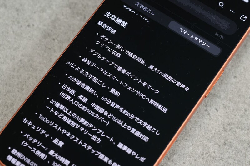 本機を実際に使用した感想として、多くのメーカーから競合品が出る中で、スマホを他の用途に使っていても録音が途切れる心配がない単体録音の安定感は大きな特徴と言える。