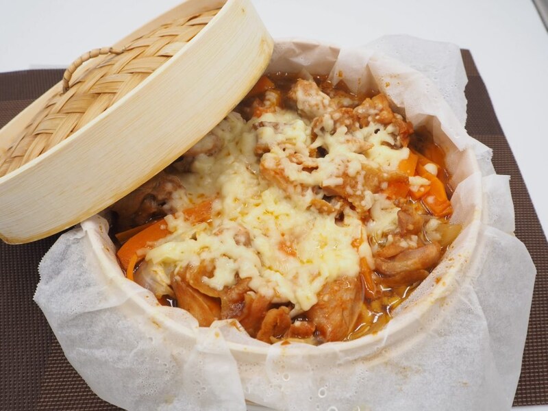 3. 約15分蒸し、肉に火が通ったら、チーズを乗せて再度蒸す。チーズが溶けたら完成。