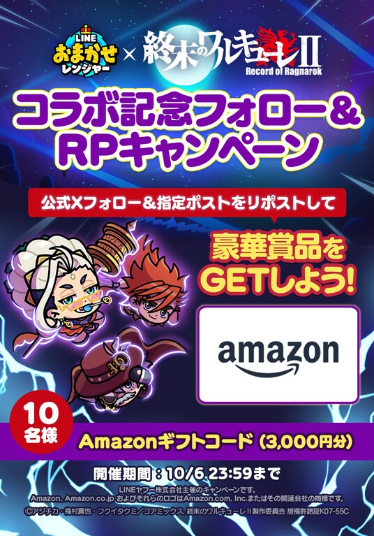 コラボを記念して「LINE おまかせレンジャー」の公式X(旧Twitter)アカウント(https://x.com/LINE_OMAREN_JP)をフォローしてキャンペーンポストをみんなでいいね&リポストして目標達成すると、抽選で「Amazonギフトコード(3,000円分)」がもらえます。