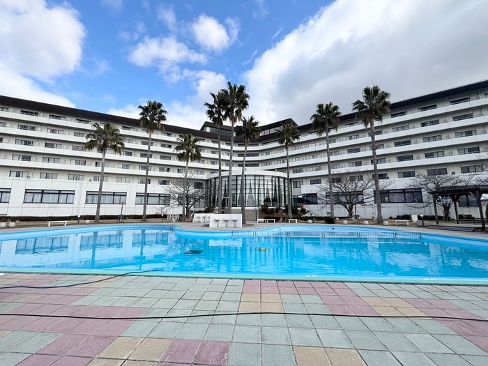 神戸からバスや車で約 1 時間で到着。プールサイドからの高台からは、青い海と緑の島影が織りなす絶景が広がり、夏にはプールサイドで日光浴が似合う真っ白なリゾートホテル。