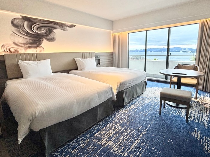 35 ㎡のゆったりとしたゲストルームは、まるで海の世界に飛び込んだような雰囲気。開放感溢れる窓からは、大鳴門橋・鳴門海峡のパノラマ、朝と夜で変化する景色を独り占めする素晴らしい景観。