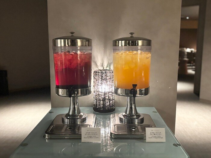 湯上がりには、「温泉ラウンジ」。15-24 時にはビネガードリンク、20-22 時には酒の提供もあり、落ち着いた空間にてひと休みして寛ぎのひととき。(午前中のドリンクの提供はございません。)