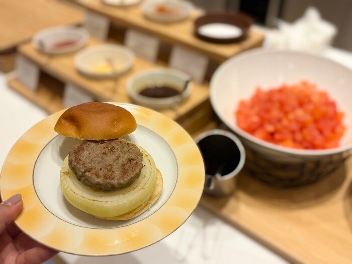 ライブキッチンでは、ジューシーな肉の旨みと玉ねぎの甘さがたまらない「淡路牛オニオンバーガー」。ソースは自身のアレンジで仕上げます。