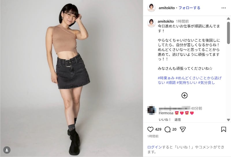 時東は「今日進めたいお仕事が順調に進んでます!」と書き出し、写真を投稿。眼鏡をかけて、ベージュのワンショルダートップスと黒のミニスカートのコーデで、鍛え上げられた美しい腹筋と美脚が際立つ抜群のスタイルを披露し、「やらなくちゃいけないことを後回しにしてたら、自分が苦しくなるからね!めんどくさいな〜と思ってることから進めて、逃げないように頑張ってますっ!!みなさんも頑張ってくださいね」とつづった。