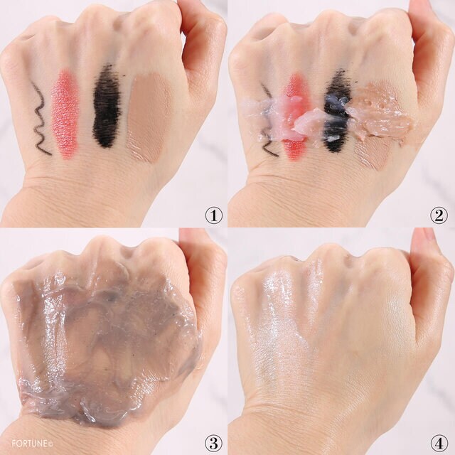アイライナー・リップ・マスカラ・ファンデーションを手の甲に塗り、「リニューイング クレンジングセラムバーム」でオフしてみました。