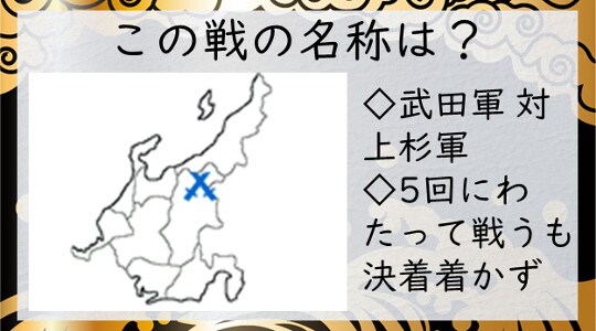 【答】 川中島の戦い甲斐の武田信玄と越後の上杉謙信が、北信濃の支配権を巡って対決。12年・5回にわたり、川中島を中心に戦いが繰り広げられましたが、決着は着きませんでした。永禄4(1561)年9月10日に発生したといわれる第四次合戦は激戦として知られ、信玄と謙信が一騎打ちしたというエピソードも残されています。