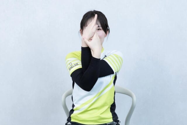 (4)両腕の位置をそのまま、顔と手のひらをぐっと近づけて15秒間キープする