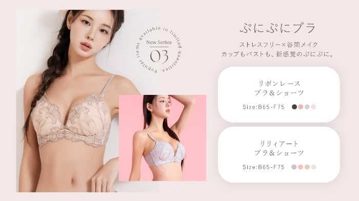 新シリーズ《ぷにぷにブラ》のリボンレースブラ&ショーツはセット価格5,560円~、カラーはチャコールグレー、ピンクベージュ、ミント、ピンク。