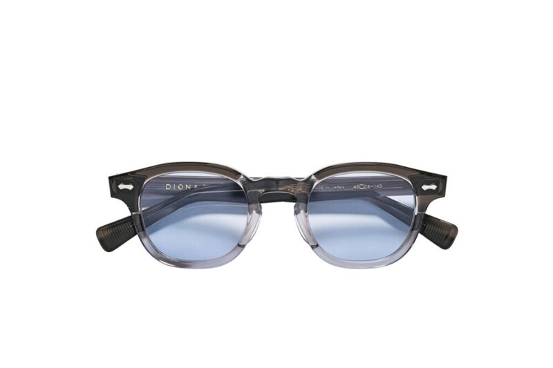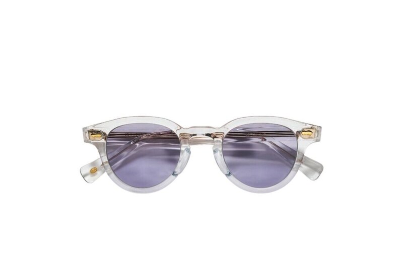 Jimmyのクリアブリッジモデルで、フレーム上部が濃色なので、よりカチッとした印象が強くなる。クリアレンズでもいいが、青系などのカラーレンズなら、程よいゆるさと上品さを両立できる。