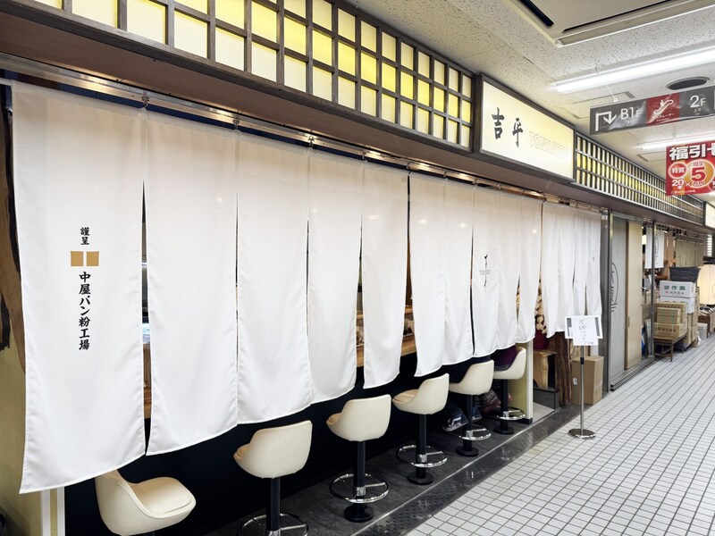 築地の「吉平」の店舗は、地下鉄築地駅から徒歩2分ほどの場所にある。築地KYビルという商業ビルの中にあり、築地グルメの名店が複数入っているビルだ。ビルに入ると、すぐに築地の「吉平」の場所がわかるはず。まぶしいくらい真っ白な暖簾に「吉平」と書かれているからだ。