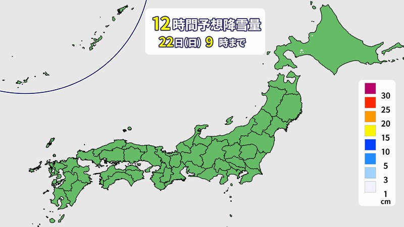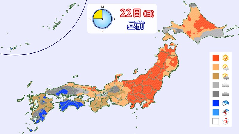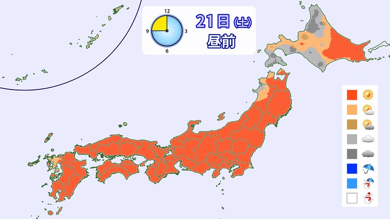 高気圧が日本の東へと移動し、南からの暖気が北海道まで流れ込みます。このため、北海道でも気温がプラスとなるところがあるでしょう。全国的に晴れる見込みです。