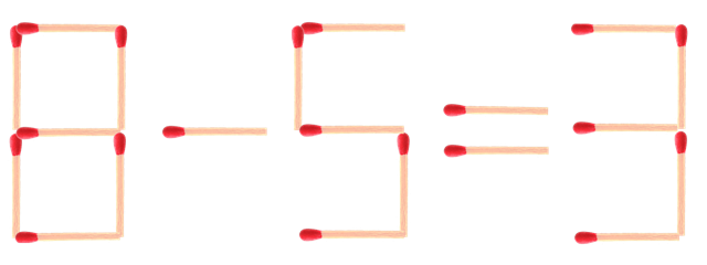 ②「+」から縦のマッチ棒を取り「9」の左下に付ければ「8-5=3」となります。