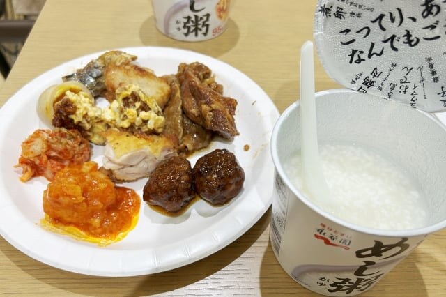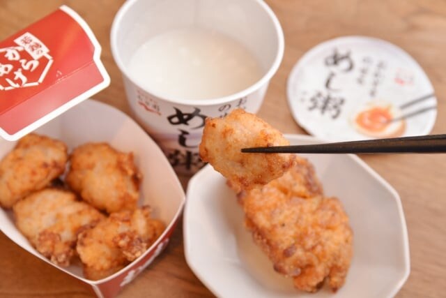 しかし、これも『めし粥』とおかずとのコントラストがよく、それぞれの味や食感が引き立て合ってナイス! 醤油ベースで和風の唐揚げのほうが合うかと思いきや、スパイシーで塩ベースのななチキも、なかなかイイと思いました。