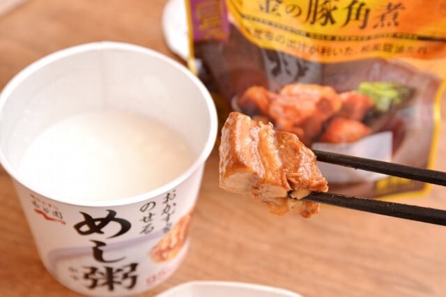 なお、『金の豚角煮 150g』は特に、濃厚で甘じょっぱいタレが袋に残るのですが、これはとろみがそこまで強くなくサラッとしてるので、『めし粥』と“液体×液体”で食べるより、普通のご飯で“液体×固体”で合わせたほうがマッチするはずです。