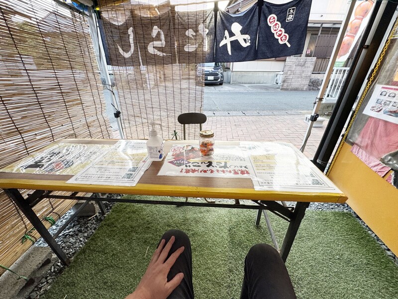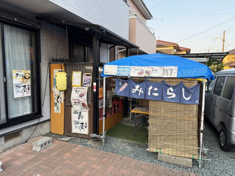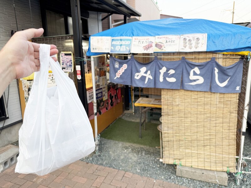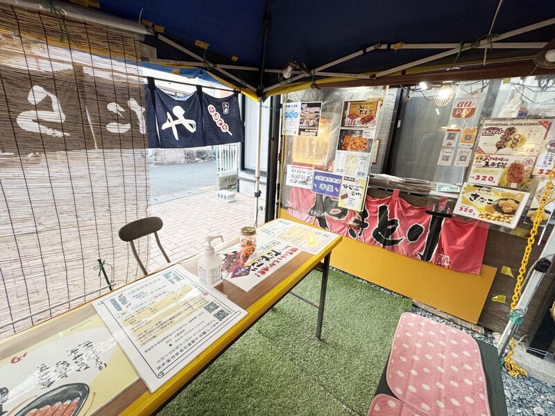 民家の敷地内にテントがあり、そのテント内で焼き鳥を買うことができる。