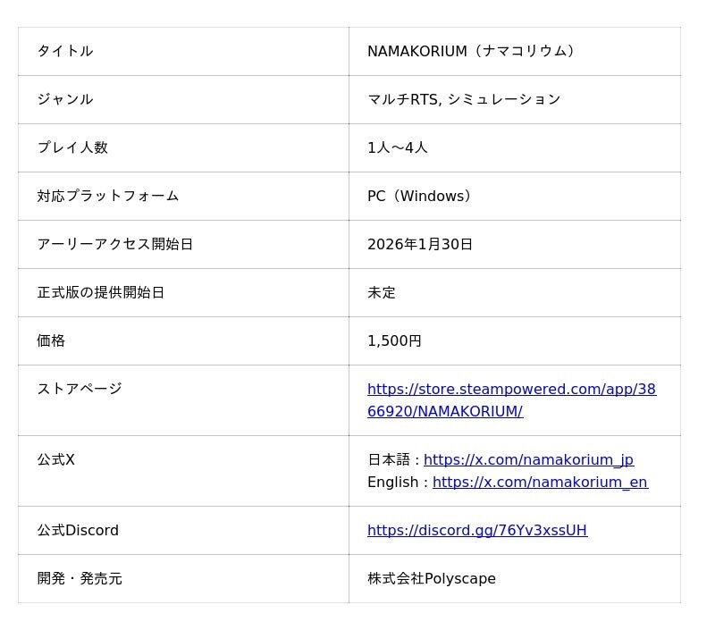 ■公式X : 日本語版 https://x.com/namakorium_jp , 英語版 https://x.com/namakorium_en