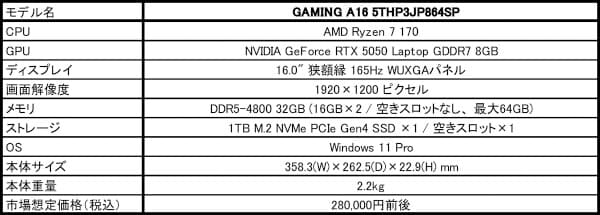 GAMING A16 5THP3JP864SPの主な仕様は以下のとおりです。