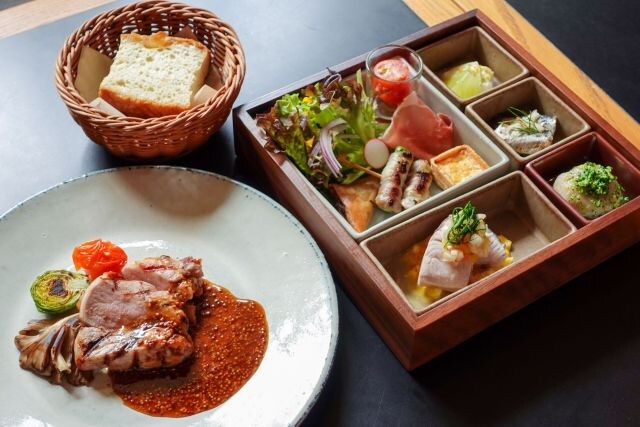「箱前菜コース」4,700円 ※前日17:00までに要予約(1人~)。写真のメイン料理は「豚肩肉のグリル」
