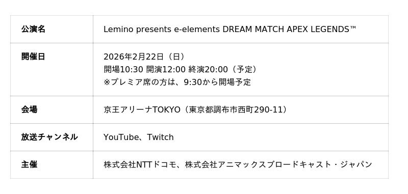 「All for Streamers」をコンセプトに、YouTube・Twitch・Mirrativなど各配信プラットフォームで活動する配信者(VTuber/ストリーマーなど)を支援する株式会社ミラティブ(本社:東京都目黒区 代表取締役:赤川隼一)は、2026年2月22日(日)に、京王アリーナTOKYOで開催される『Lemino presents e-elements DREAM MATCH APEX LEGENDS(TM)』へMirrativ配信者が出演することをお知らせいたします。