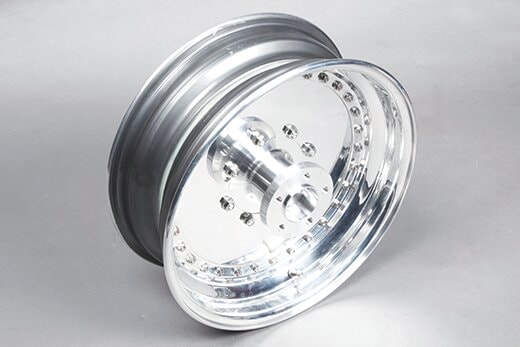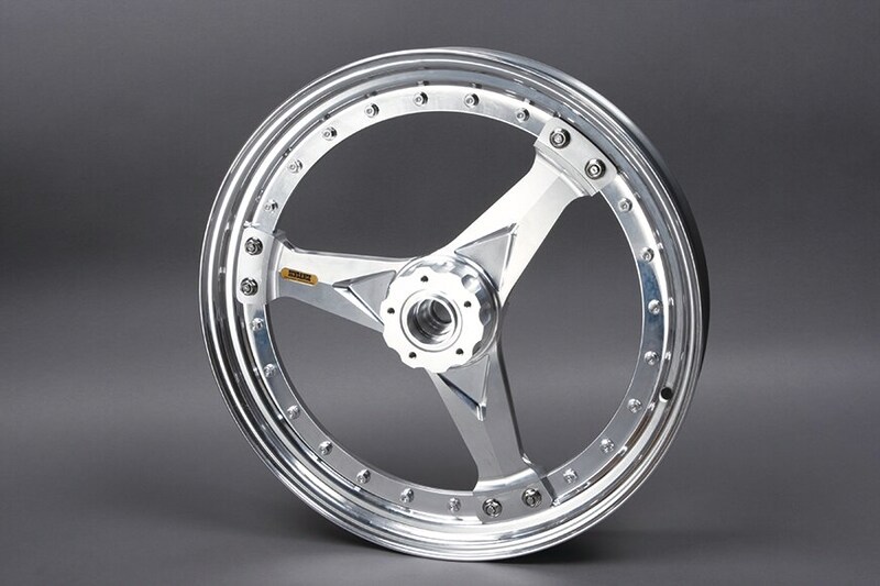 軽量アルミリムと、熱処理したA6065材削り出しのセンターハブを組み合わせた4ピース構造ディッシュホイールもコブラ定番のパーツ。“H”と“I”のコンロッドデザインを組み合わせたアルミ削り出し3スポークホイールも性能とデザインを両立する。いずれにしてもドラッグイメージが基本である。