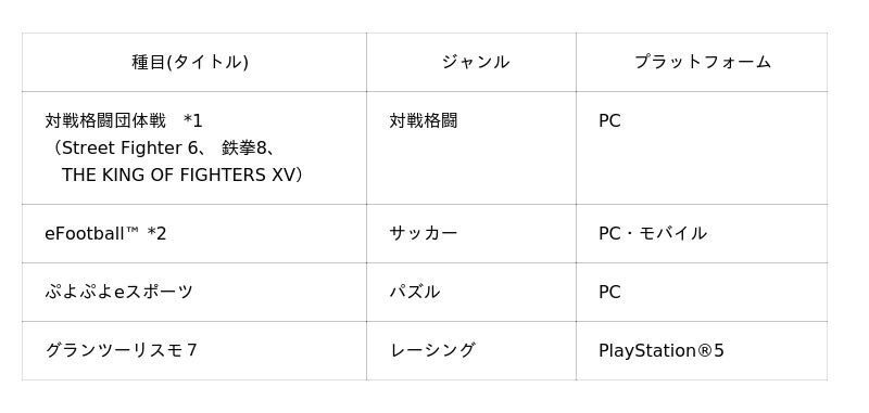 「Street Fighter 6」、「eFootball(TM)」、「グランツーリスモ7」の出場選手については、現在、大会等による選考を準備しています。決定次第お知らせしていきますので、引き続きご注目ください。