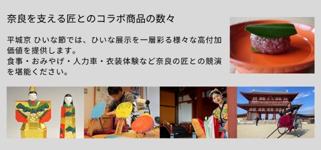 会期中は、食事・おみやげ・人力車・衣装体験など、奈良の匠とのコラボレーション企画も実施。ファミリーや友だち同士で、思い思いに楽しめそうです。