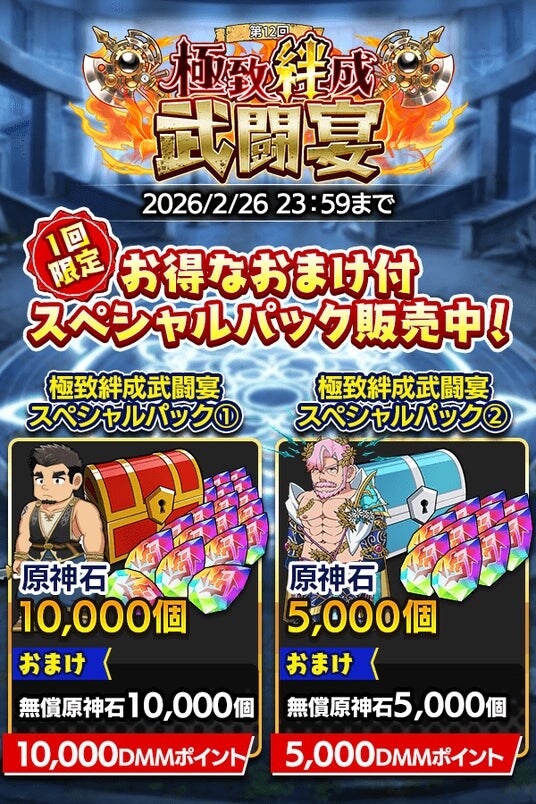 さらに、期間中に原神石がおトクに購入できる「第12回極致絆成武闘宴スペシャルパック」が2種登場! レインボーキーや超神器のカギ、至武の軍旗、躍魂の輝石などがセットになった「極致絆成武闘宴応援パック」も4種登場! 期間限定のこの機会をお見逃しなく。
