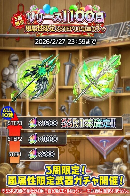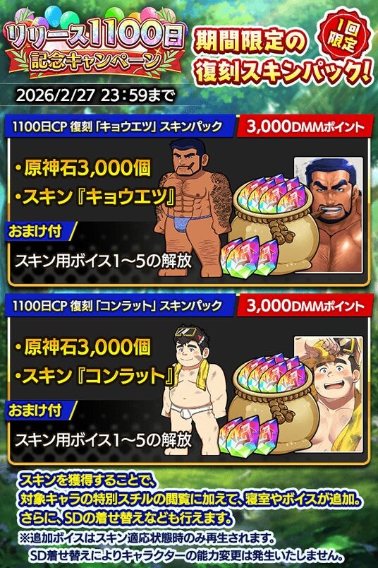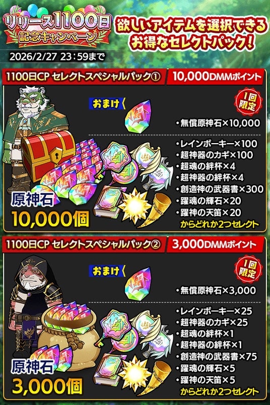 サービス開始から1,100日を記念して、原神石をはじめとした豪華アイテムが獲得できる期間限定ログインボーナスやデイリー&総合ミッションが登場! その他にもお得なガチャやパック販売などがございますのでぜひお見逃しなく!
