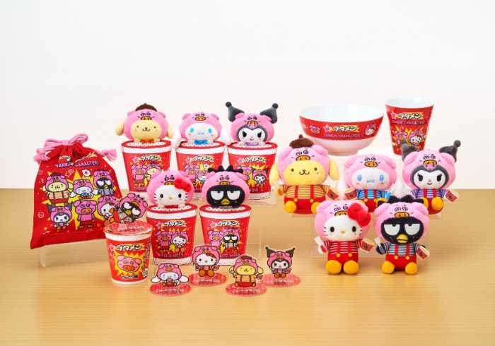 1993年の発売以来30年以上愛されてきた「ブタメン」。今回のコラボでは、ハローキティ、ポムポムプリン、シナモロール、クロミ、バッドばつ丸がブタメンくんになりきったオリジナルデザイン全18アイテムが登場します。