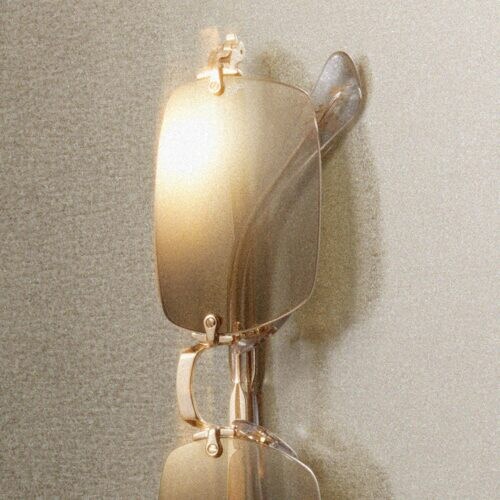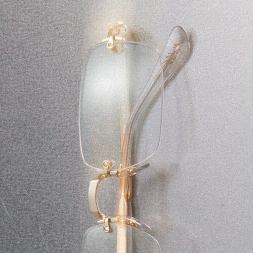 ミニマルなデザインが圧倒的な存在感を放つ、大胆なリムレスモデル。超厚レンズがレクタングルシェードに建築的なラインを際立たせ、シンプルでありながら非凡な印象を与える。