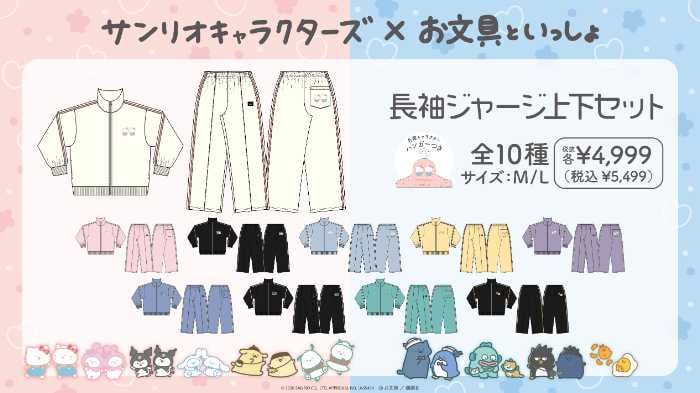 デザインはトレーナーと同じく全10種で、お文具さん×ハローキティ、マイメロディ、クロミ、シナモロール、ポチャッコ、プリンさん×ポムポムプリン、猫さん×タキシードサム、名も無き者×バッドばつ丸、子猫さん×ハンギョドン、ゼリーさん×ぐでたまをラインナップ。