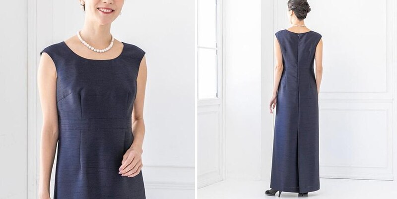 ジャケットの同じシャンタン生地のワンピースは、ジャケットやボレロを合わせた時にすっきりと見えるように計算された襟の開きです。また、背面にはサイドプリーツがあり、ロング丈でも歩きやすいように設計されています。