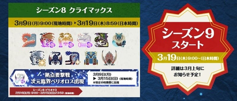 次元臨界ベリオロスはもちろん、みなさんおなじみの漂移錬成&ピックアップモンスターのほか、シーズン8から9へとまたぐ特別なイベントにも注目していこう。