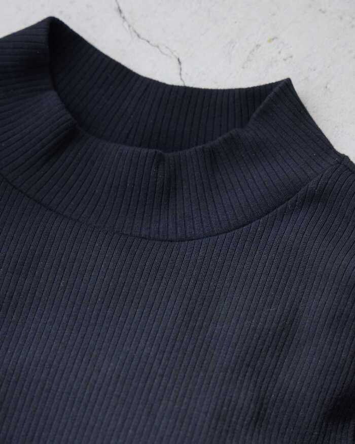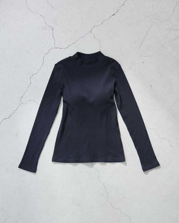 プチハイネックと手の甲まで届くやや長め袖で、女性らしさをプラス。細リブ素材でインナーに見えない生地感と縦ライン強調のシルエットを実現。