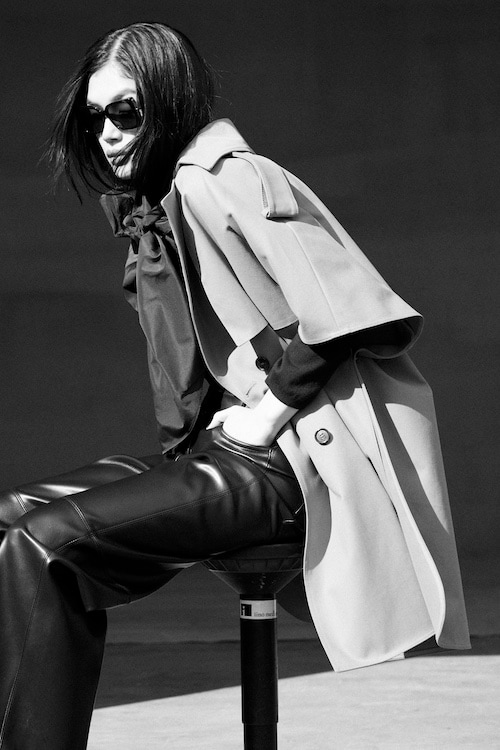“After Hours”では、トレンチコートを一枚でドレスのように纏い、ウエストマークによって、洗練されたナイトスタイルを演出。