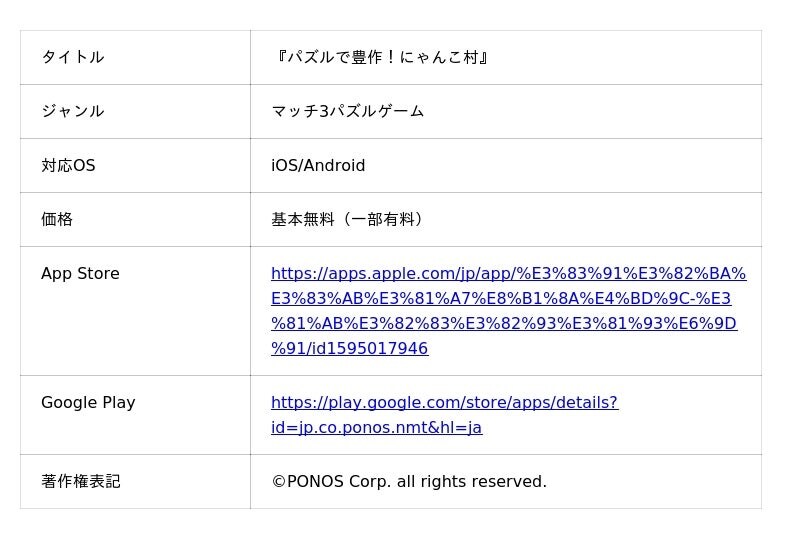 ポノス株式会社(本社:京都府京都市、代表取締役:辻子依旦、以下「ポノス」)は、スマートフォン(iOS/Android)向けゲームアプリ『パズルで豊作!にゃんこ村』にて、ネコの日を記念した特別なキャンペーンと、新イベント「脱出!ネコゲーム」を開始いたしましたので、これをお知らせいたします。