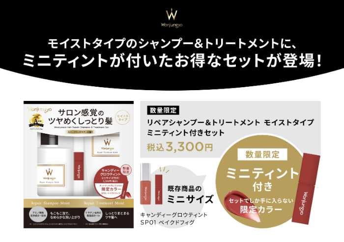 今回登場するのは、Wonjungyo Hairリペアシャンプー&トリートメント(モイスト)ミニティント付きセット3,300円(税込)。