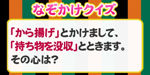 「から揚げ」×「持ち物を没収」その心は…?「から揚げ」とかけまして「持ち物を没収」とときます。その心は?