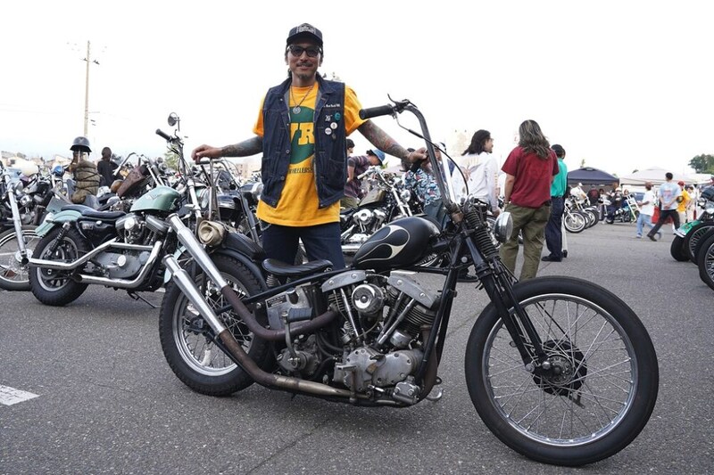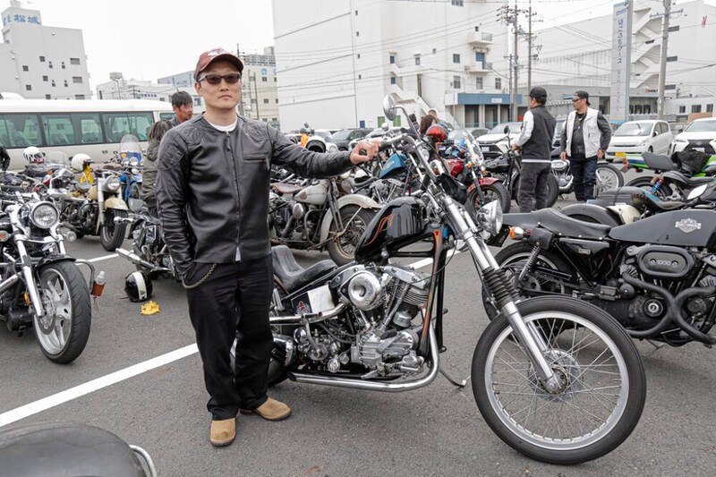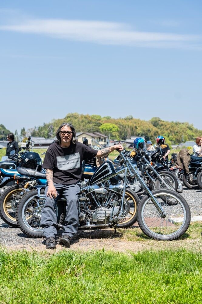 ピンストライプによってラインが強調されたモールディングフレームにパンショベルを搭載する70sスタイルのチョッパー。白Tにエリなしのレーシングシャツを合わせた、ラフなレザーの着こなしがクールだ。