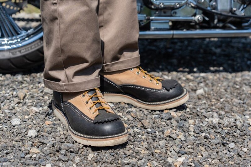 「ZON」がビルドしたエボリューションチョッパーに乗る東さん。ラフなコーデに合わせたブーツはツートーンのジョブマスター。バーラップレザーとクロムエクセルレザーのコンビによる上品な表情が◎。