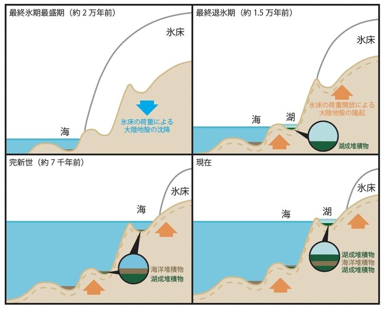 だから、場所によっては、約2万年前には氷床の下にあった地面が、約1.5万年前に氷床の融解で湖になって、また約7千年前に海面上昇で再び海に沈み、現在は氷床の縮小による地面の隆起で湖に戻っている、なんてことが起きます。