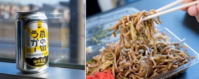 大豆生田(おおまめうだ)商店のジャガイモ入り焼きそばも地元で知られるご当地グルメ。手で持つとズッシリ重い満足サイズですが、それでもお店で出す並より少ないのだとか。甘めのソースでほっこりした味わい。油伝麦酒(あぶでんばくしゅ)の『蔵の街ラガービール』はすっきりキレのある喉越しです。焼きそばや焼き鳥などをおつまみに味わいました。
