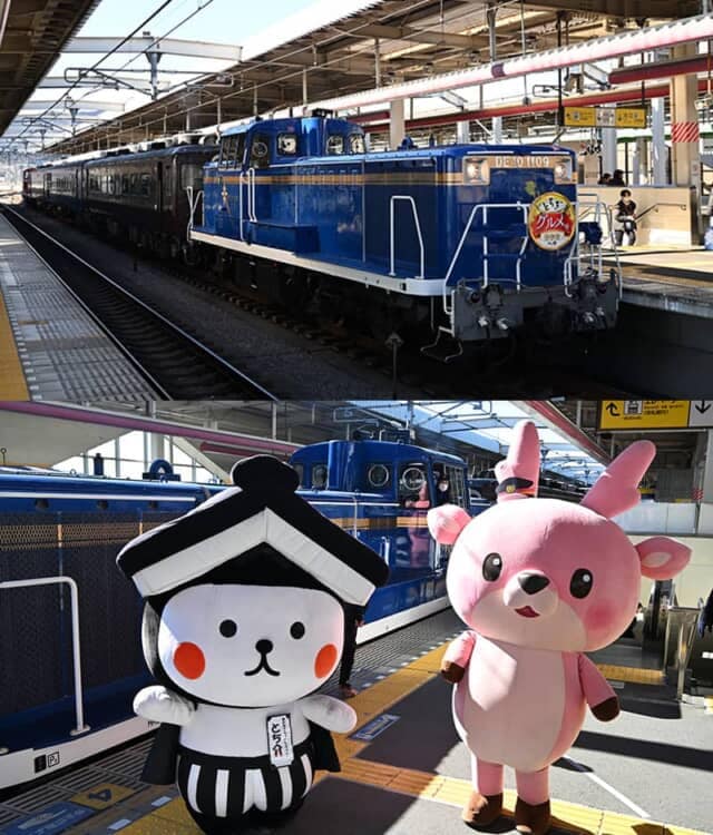 先頭のディーゼル機関車はDE10形1109号。1971年製造で、青森駅構内での客車や貨車の牽引や入換作業などで活躍していました。カラーはJR北海道が所有していた、DD51形ディーゼル機関車を思わせる青色に金色の帯や流星マークが特長。栃木市のキャラクター “とち介” と、同市に本社を置く『岩下の新生姜』の公式キャラクター “イワシカⓇ” も出発のお見送りに現れ大盛り上がりでした。
